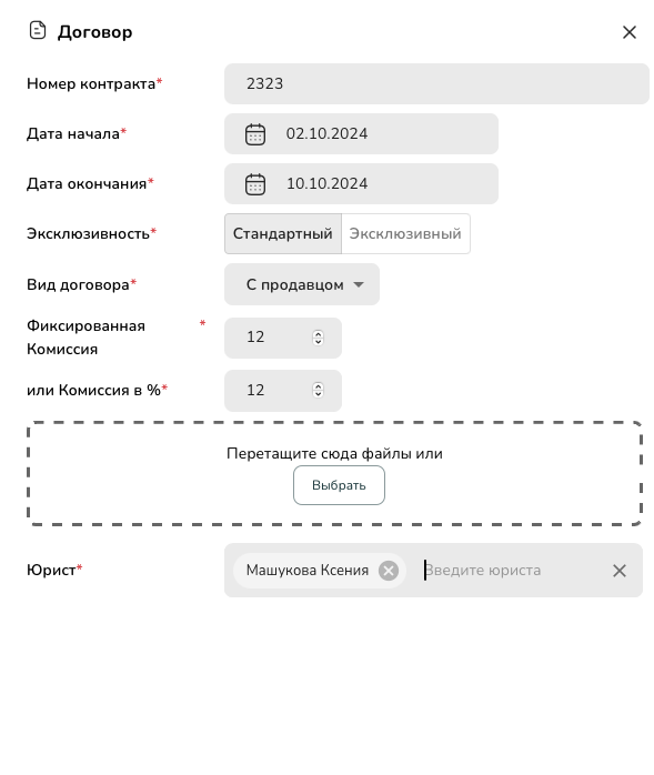 Обязательно заполните поле юрист, это юрист который будет работать с вашей сделкой