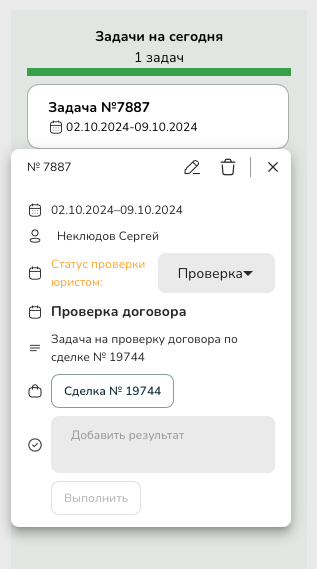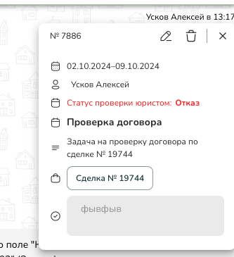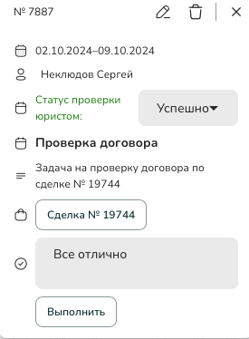 4. После проверки договора в задаче вам потребуется выставить статус, и написать результат проверки.