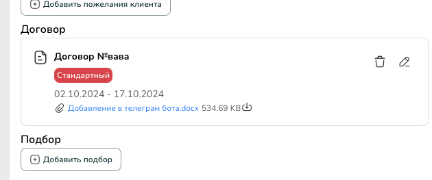 1. На вкладке сделки нажмите на кнопку добавить договор