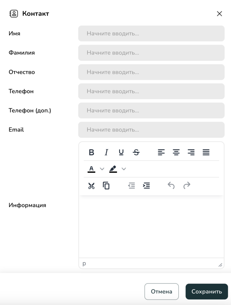 Основная работа с контактами осуществляется внутри сделок, что обеспечивает более удобное управление информацией о клиентах. Вот как происходит создание контакта в сделке